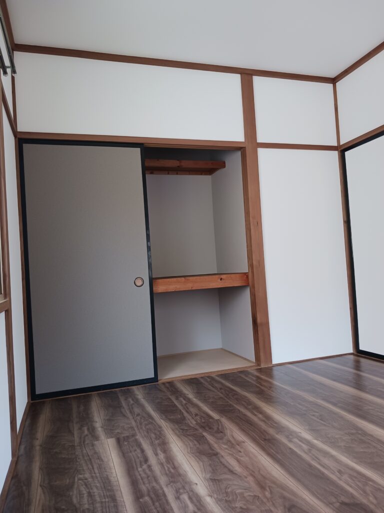 内容は『和室の床の底冷えを何とかしたい。』既存の床は床板敷きの上に畳をのせてある昔からの工法で日本家屋では当たり前の工法でした。湿気には最適ですが、冬の寒さには現代っ子にはきついかもしれません。心優しいオーナー様は、ファミリー向けの貸家という事もあり、畳からフローリングにし、床には断熱材を敷き寒さ対策をしたうえでクロス等を交換しました。