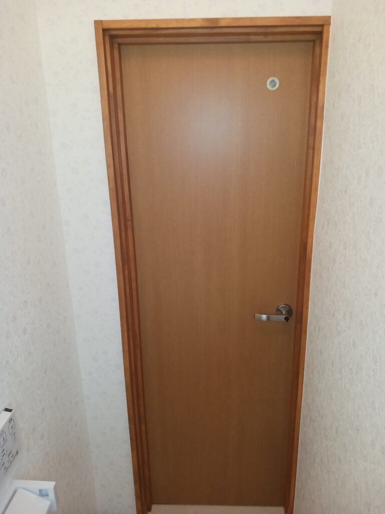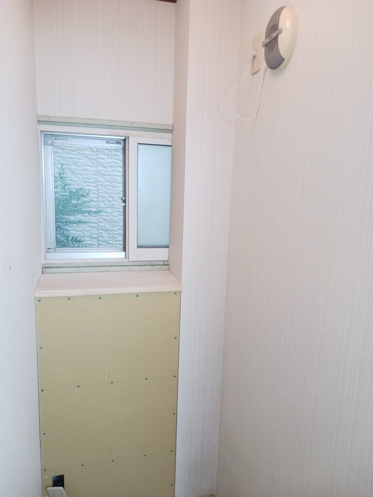 パイプスペースがある為、既設のトイレはその分 前に設置してあり、後ろに空間があり 埃が溜まりやすく、またお掃除がしにくい状態でした。ただしこれを無くしてスッキリさせるには、大がかりな工事が必要になります。限られたご予算もあり、ご提案をしたのはこの隙間に壁を作って埋めてしまえ!って事でお話ししました。もちろんこのスペースに収納棚を作る事も可能でしたが、今回は単純に壁を作りました。完成後はスッキリした空間になったと思います。扉も今ある枠を壊さず、建具屋さんにオーダーして新調しました。
