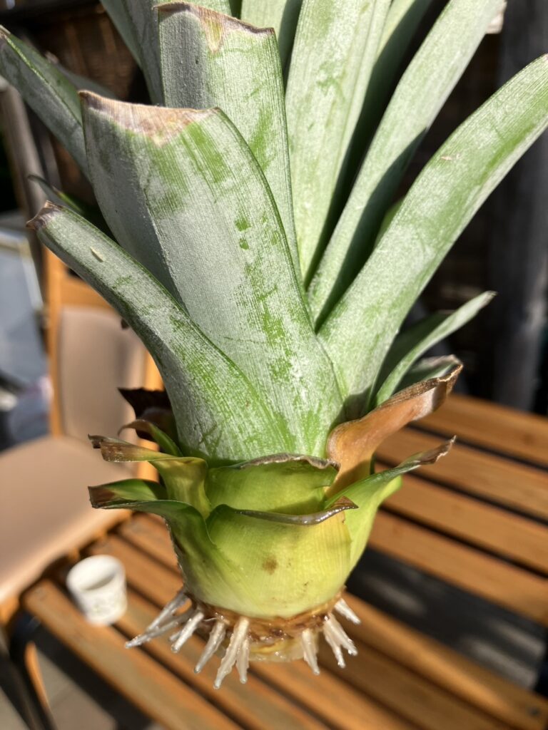 8月初旬、食べた後のパイナップルは 青森でも再生栽培できるのか?とふと思いまずは 水へ イン数日で かわいらしい根が出てきました