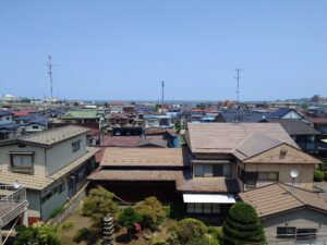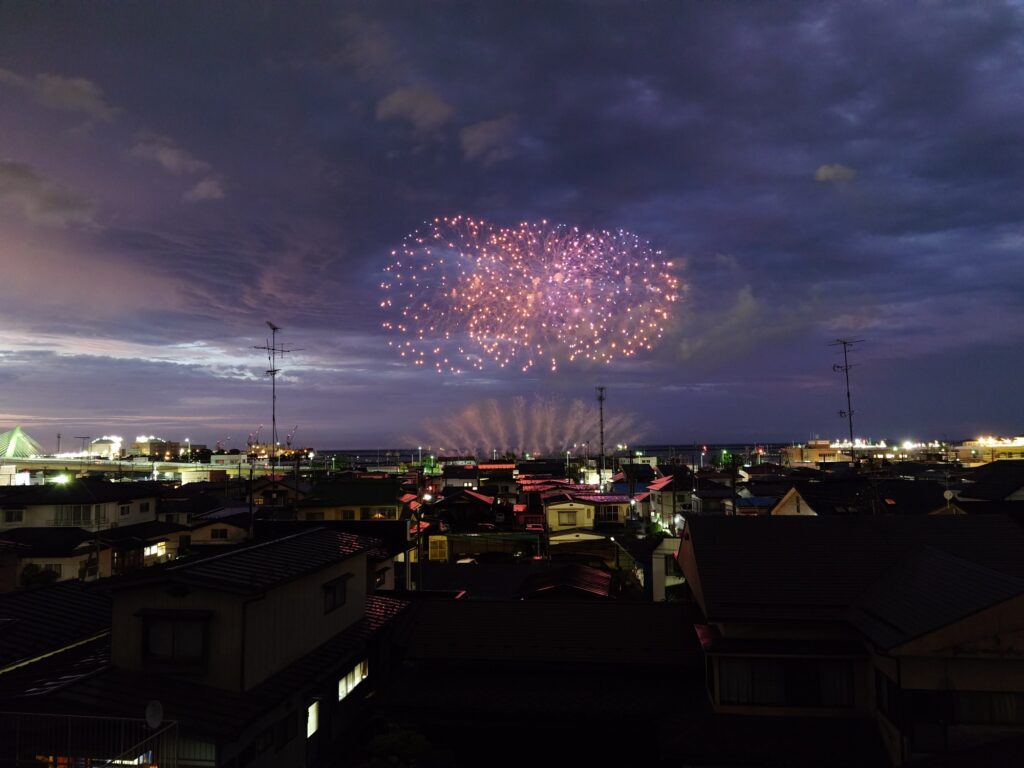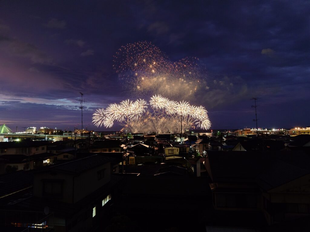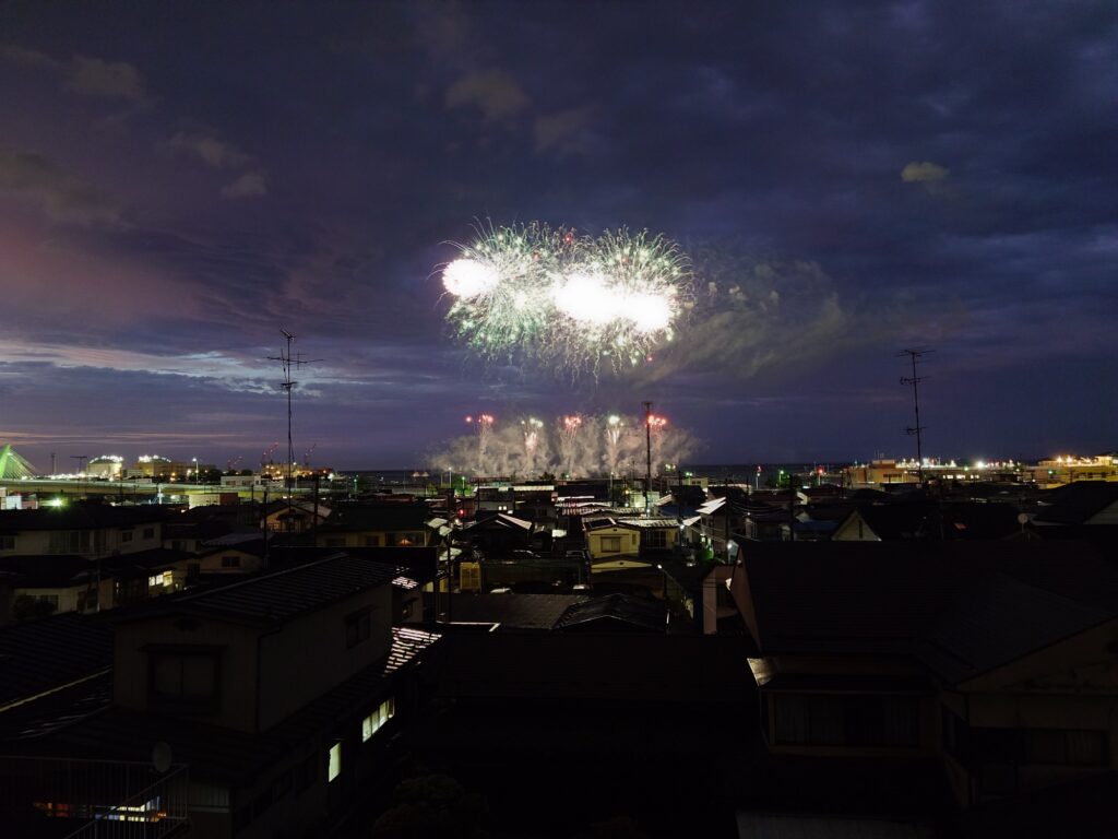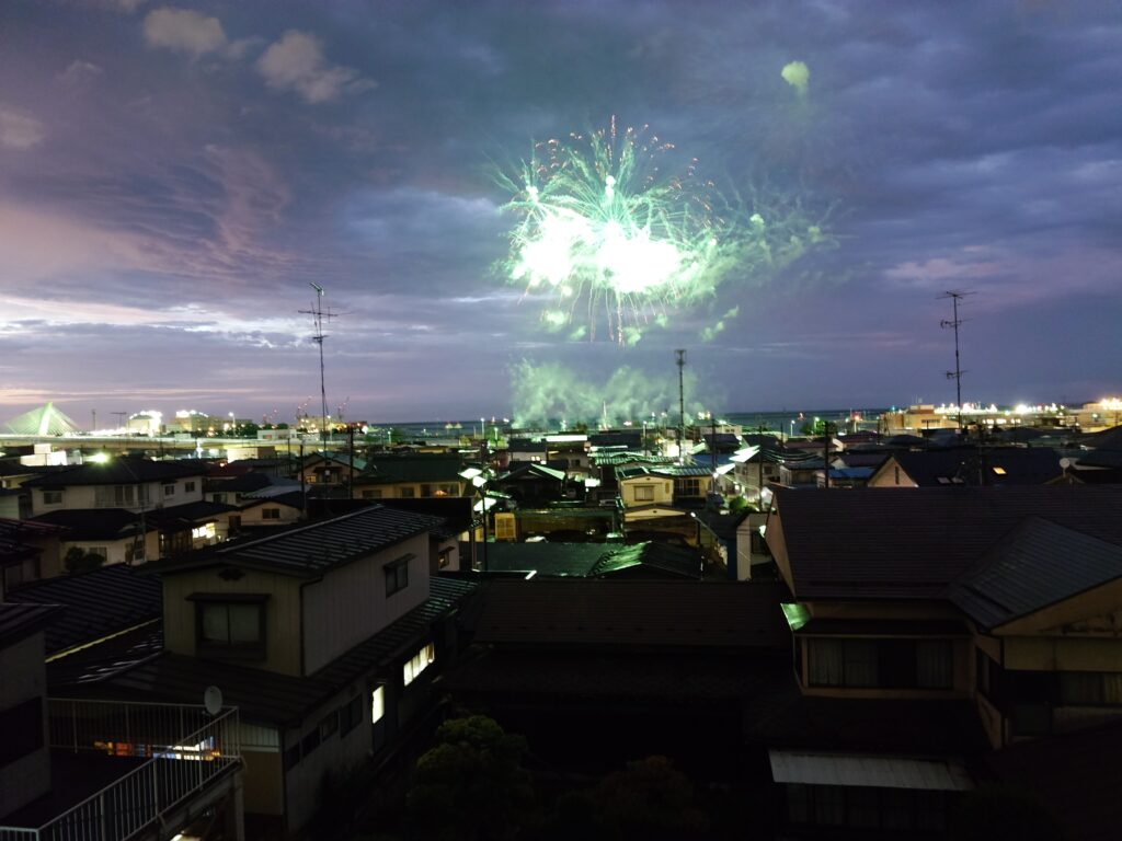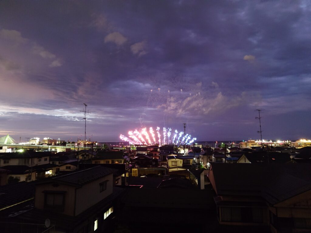 舘鼻から、直線で800mくらの位置に自宅があり、高台にあるため、正面から花火が見えます。