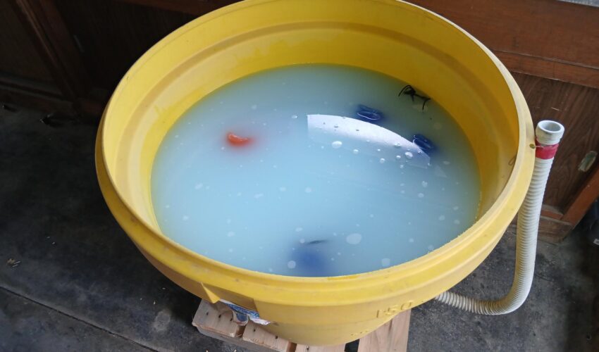 先週の日曜日に、苗作りのための『たねもみ』の消毒を行いました。この水色の水が消毒入りの水で、この中に苗のもとになる『たねもみ』が入っています。この水を何回か入れ替えて、徐々に消毒液を抜いていきます。この時 冷たい水を入れないと、発芽が早まってしまうそうです。このまま冷水での入れ替えを繰り返して、4月中旬の苗代の時期に 適度に発芽するように調整していきます。