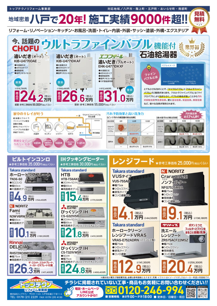 エコな給湯器や、家中キレイ♪ ウルトラファインバブル機能付給湯器などへのグレードアップも含めて、買替えは少し早めのご検討をおすすめします。