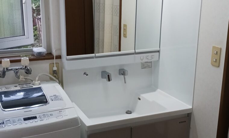 現地調査をさせていただき、洗面化粧台の上に棚板があり その下に納まる高さ180cmが条件となり、今回はタカラスタンダードのファミーユを選ばさせていただきました。一般的には180cmを超える物が多いのですが、三面鏡タイプはサイズを選べるシリーズがありますので、ご希望に添える商品をご提案できたかと思います。