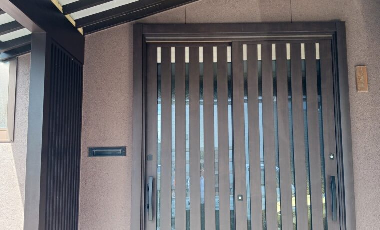 玄関扉を断熱仕様にすることで 気密性も増し寒さ対策にもなります。引戸から開き戸にする事も可能ですが、外壁や内装にも影響があるので 玄関引戸のカバー工法をご提案しました。外観の雰囲気から、引戸のままでデザインを変えても違和感のない仕様になると思います。