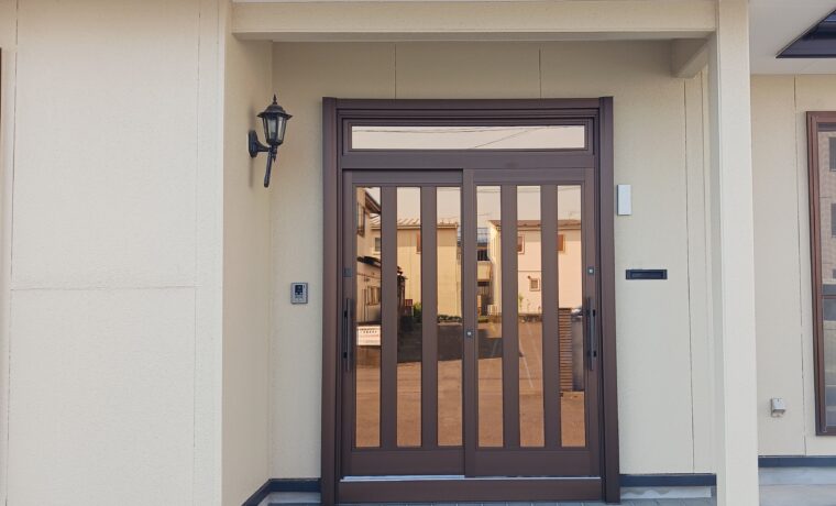 以前とほぼ一緒のデザインのため、違和感なく使っていただいています。中からの視認性も高く、安心して来客を迎えられているとのこと。断熱玄関引戸は重いと聞いていたが、引手ハンドルがあるので、使いやすくなりました。